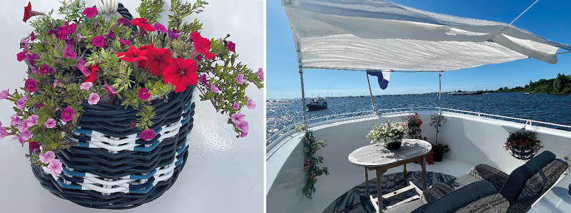 Zomerse hitte is het vandaag in Heeg met 31 graden. Maar het voelt heerlijk rond de 25 op het water met de wind. In de ochtend geef ik de manden voor onze bloemen een andere kleur. Nu het nieuwe kleed grijs/blauw gemêleerd is vind ik de rode details niet zo passend, mooi klusje lekker buiten.