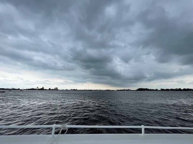 We zitten nog even buiten maar de ergernis is te groot, 3 soorten house beats door elkaar schitteren over het water onze kant op. Ik word oud geloof ik, en we gaan maar in stuurhut zitten. Stuk beter, bovendien laat de lucht ons bijna dwingen naar binnen te gaan!
