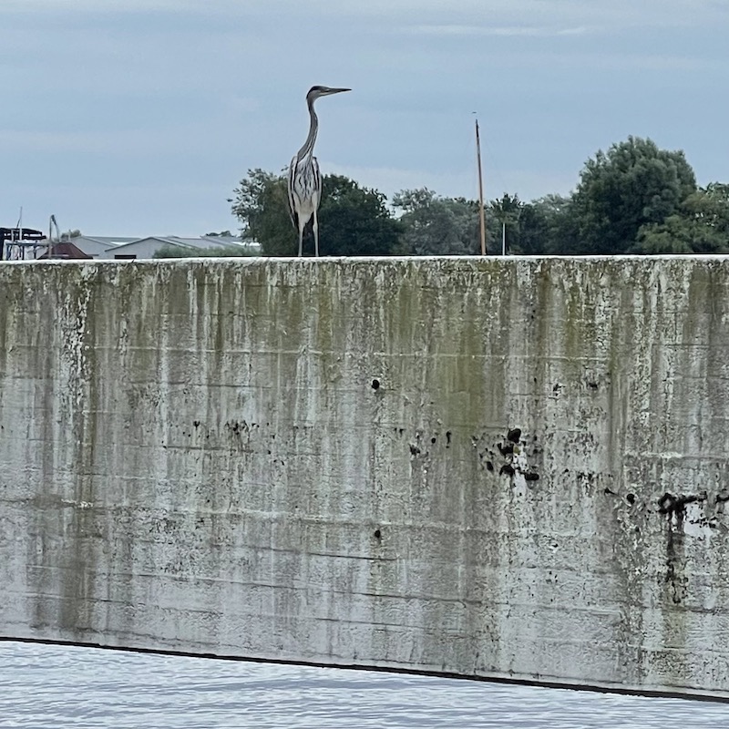 De volgende ochtend om 7:00 start de motor en om 9:00 liggen we in Terherne. De reiger staat op de sluis van Terherne ons te verwelkomen.